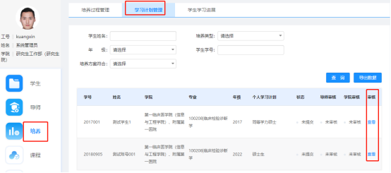 导师审核步骤:登录系统后,点击“培养”-“学习计划管理”,查看学生选择的课程,符合要求的,通过审核。