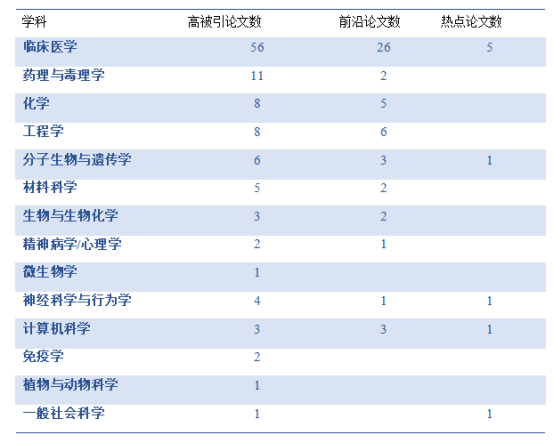 高被引论文110篇,学科分布如表3,临床医学最多,为56篇,远超其他学科;其次为药理与毒理学、化学、工程学和分子生物与遗传学。