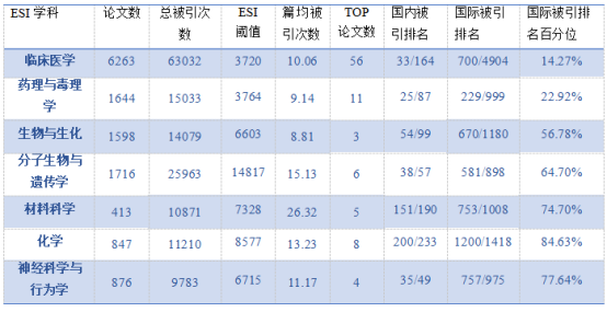 本期番茄小说 7个进入ESI全球前1%的学科的国际被引排名百分位较上一期均有所提升,分子生物与遗传学上升幅度最大。临床医学进入前1.427%,药理与毒理学进入前2.292%。ESI学科具体表现见下表。