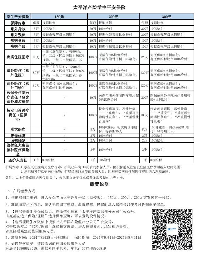 3、做好学生政策咨询答复工作。请各学院辅导员了解大学生医保险和学平险基本政策内容。寿保保险公司服务专员:杨弘(联系方式:18066327757),太保保险公司服务专员:余敏(联系方式:13587880077),将协助各位老师做好学生咨询答复。