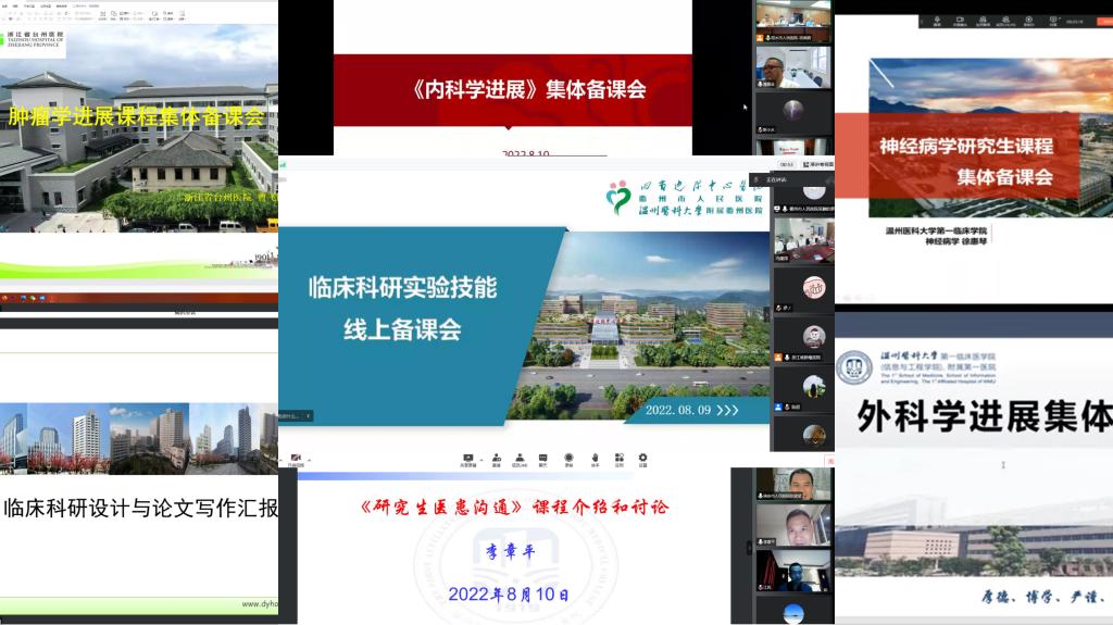 为增强研究生教学内涵建设,提升研究生培养基地临床教师的教学基本规范和教学水平,促进各基地交流学习,不断提高临床教学质量,8月8日-8月14日,学校组织召开《外科学进展》《临床科研设计与论文写作》《肿瘤学进展》等十余门医学类专业课程线上集体备课会,会议邀请学校教学专家对课程进行示范性教学与指导,丽水市中心医院、台州医院、浙江省肿瘤医院等15所基地课程负责人、教学团队及教学管理人员共400余人参与本次会议。