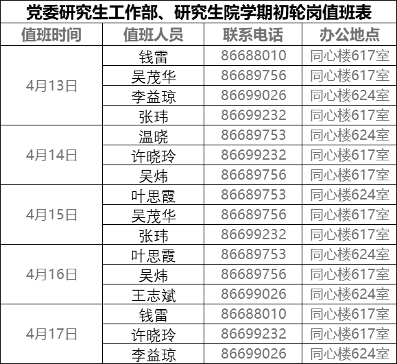 疫情期间,为保证研究生教育管理工作整体有序运转,研究生院执行轮岗值班制度,4月13日起一周内值班安排如下表,请需要办理相关业务的研究生注意值班时间。