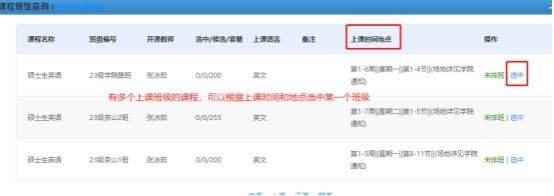 3、选班时,如遇到上课时间冲突的课程,处理方式如下:假设A课程有2个时段的班级,选中了第一个班级,操作B课程选班时,系统提示上课时间段冲突,那么可以将A课程班级更换为第二个班级。