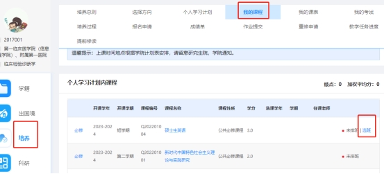 2、操作步骤:点击培养--我的课程,针对开课学年为“2024-2025学年第二学期”的课程,点击“选班”!根据上课时间地点选中上课班级。