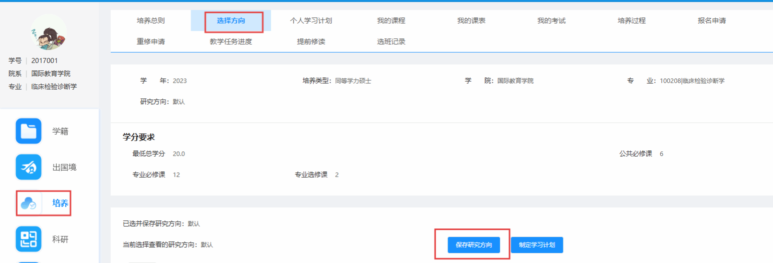 选择培养方案研究方向:学生需要先选择研究方向,才能进入后续的个人学习计划制定的工作。流程:点击培养---选择方向---选择研究方向(此处研究方向的选择与开设课程关联,不会影响实际科研研究方向,大部分专业此处方向为默认,选择“默认”,个别专业如肿瘤学、儿科学、药学、医学技术等专业,不同研究方向上课要求不同,需提前和导师确认好研究生方向,便于选课!精神病与精神卫生学专业因部分学生需在杭州、丽水或湖州进行联合培养,方向选择杭州班、丽水班或湖州班 ,其余学生均选择温州班。