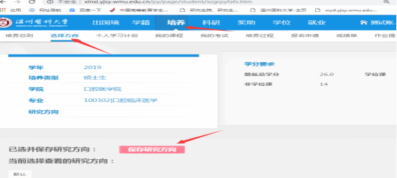 (1)选择培养方案研究方向:学生需要先选择研究方向,才能进入后续的个人学习计划制定的工作。流程:点击培养---选择方向---选择研究方向(此处研究方向的选择与开设课程关联,不会影响实际科研研究方向,大部分专业此处方向为默认,选择“默认”,个别专业如肿瘤学、儿科学、药学、医学技术等专业,不同研究方向上课要求不同,需提前和导师确认好研究生方向,便于选课!)