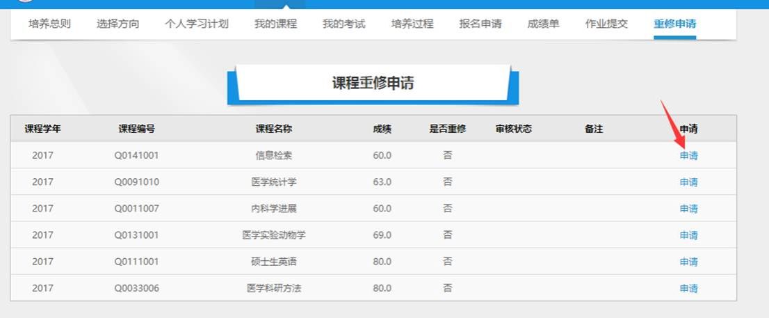 登录研究生管理系统:培养---重修申请---点击课程后的申请按钮即可完成该门课程的重修申请。