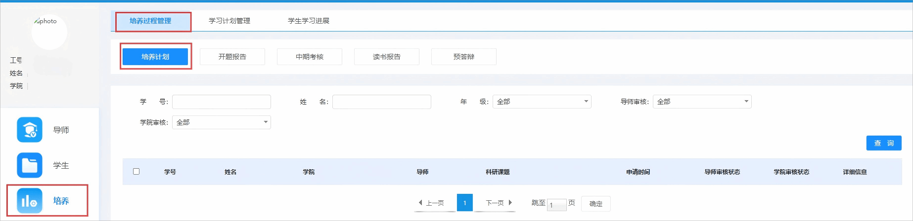 (二)导师审核:完成的培养计划需提交导师审核,经导师同意后方可打印成书面版本上交学院。导师登录系统后,进入学生管理——过程管理——培养计划,可查询学生填写的培养方案并进行审核,导师也可驳回学生的培养计划,经学生修改后再次提交审核,操作办法详见附件1。