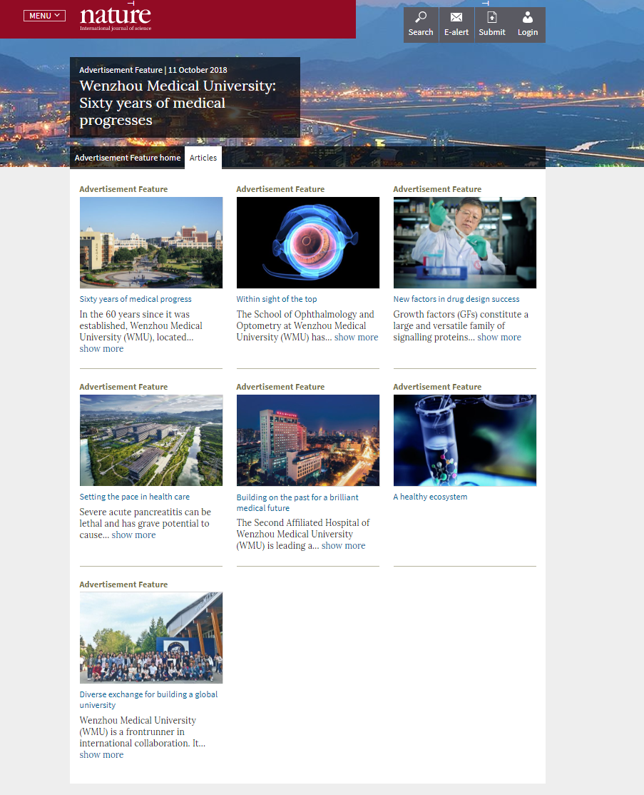 在温医大迎来建校60周年之际,Nature杂志以“Making Medical History”为题,以9个版面篇幅向全球学术界全面呈现了学校60年来秉承“仁肃勤朴、求是奋发”的校训精神,坚守特色、敢为人先、传承与创新并进、理想与荣耀交织的辉煌历程。