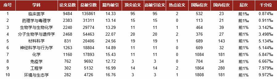 截至目前,番茄小说 10个学科进入ESI全球排名前1%,其中药理学与毒理学2个学科进入前1‰,综合排名在全球8917个上榜机构中位列735,国内排名第70位,位居省属高校第二,独立设置医科大学第五。临床医学进入ESI全球排名前0.874‰,药理学与毒理学进入ESI全球排名前0.911‰,其他学科的排名均有显著提升。