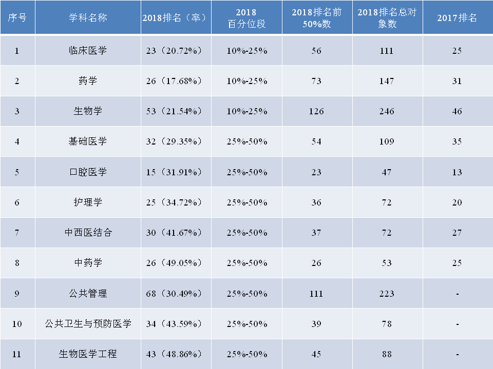 11月1日,上海软科正式发布2018“中国最好学科排名”。番茄小说 临床医学、药学、生物学、基础医学、口腔医学、护理学、中西医结合、中药学、生物医学工程、公共卫生与预防医学、公共管理等11个学科上榜,上榜学科数较上一年度增加3个,临床医学、药学和基础医学等学科排名均有明显提升。