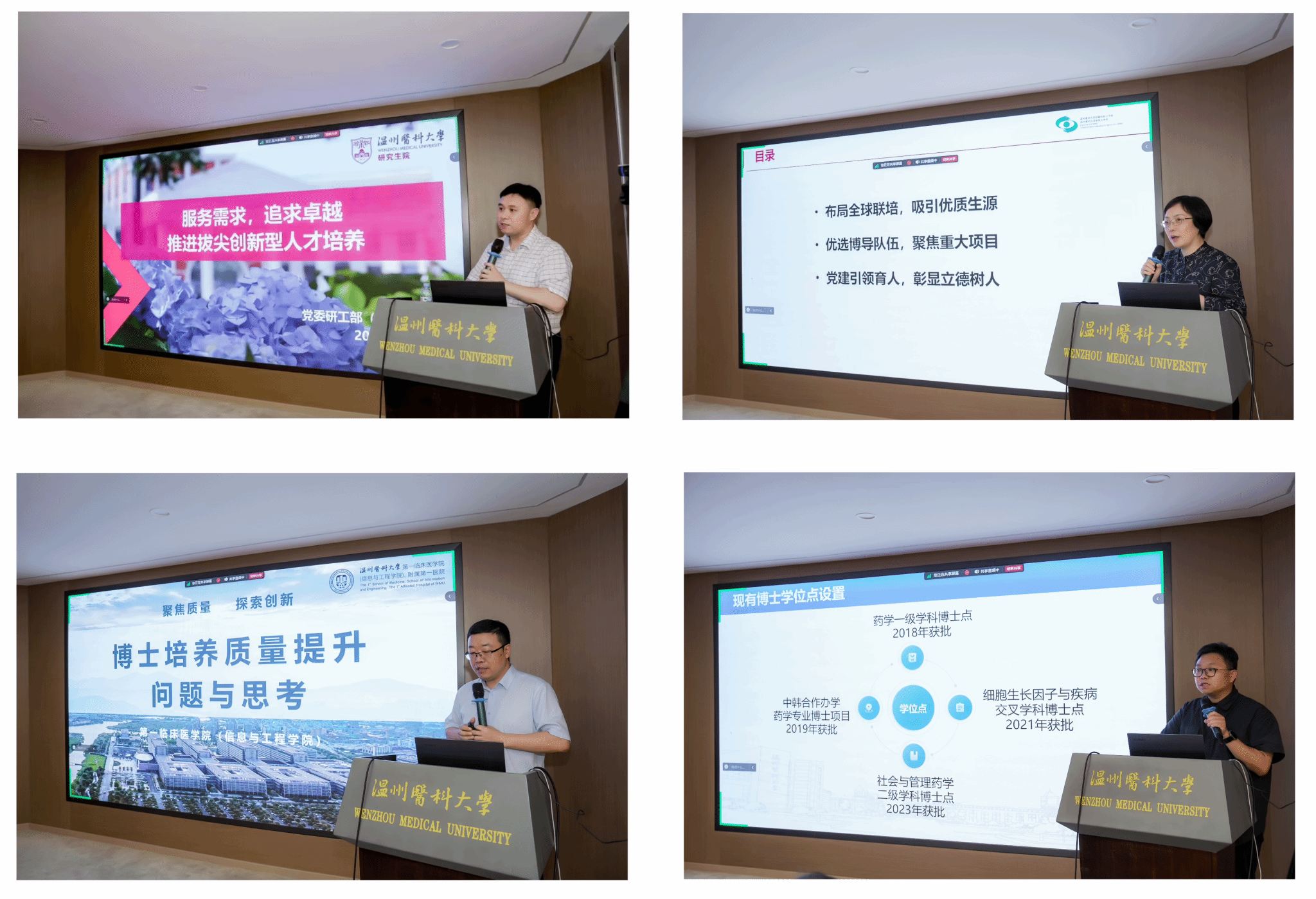 会上,党委研究生工作部、眼视光学院(生物医学工程学院)、药学院、第一临床医学院(信息与工程学院),研究生院、检验医学院(生命科学学院)、第二临床医学院等单位分别围绕博士生培养和研究生就业工作作典型交流发言。
