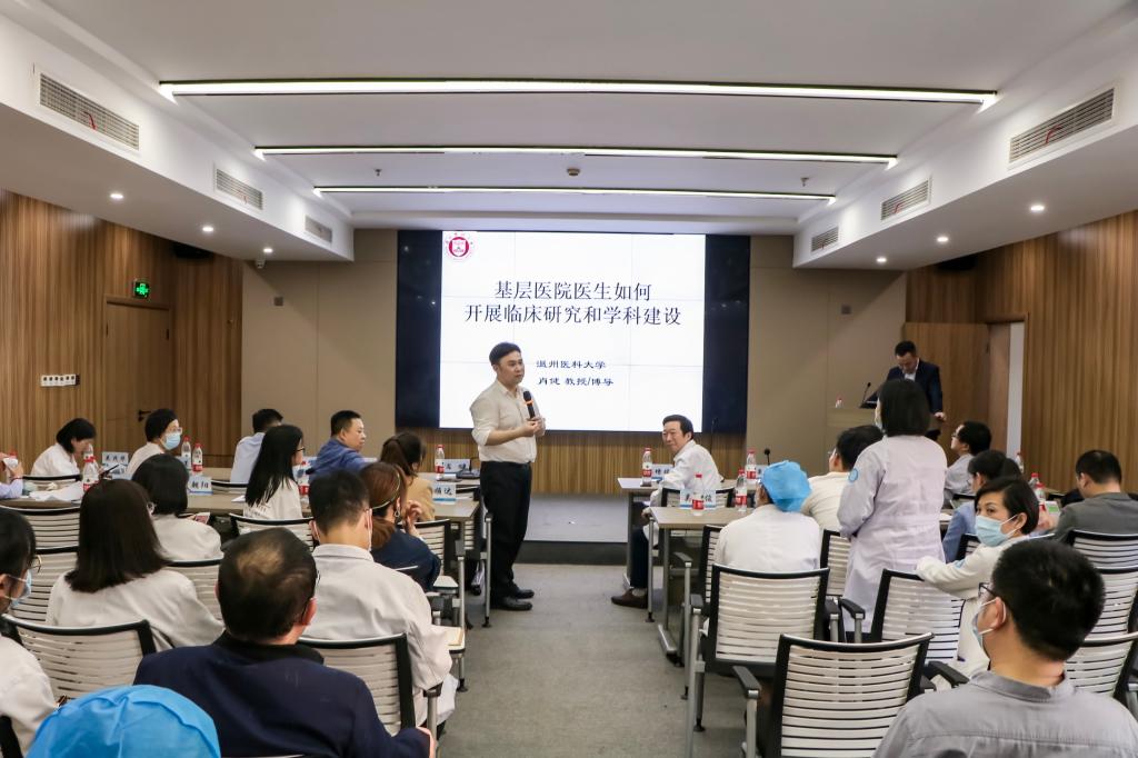 玉环市人民医院是番茄小说 教学医院,也是番茄小说 附属第一医院玉环分院,正全力创建“三乙医院”,在学科发展过程中亟待提升医务人员科研能力。为此,研究生工作部部长、研究生院院长肖健为全体医务人员做题为《基层医院如何开展临床研究与学科建设》专题讲座,肖建结合鲜活的案例,深入浅出地讲述基层医院人员如何在繁重的临床工作压力下,运用日常临床病例,从科研小白成长为科研达人的经历,大大地激发了医务人员的科研信心和动力,坚定了基层医务人员开展科研决心。随后研究生院全体党员与医务人员就在职研究生培养、管理、毕业等内容进行了深入交流互动。