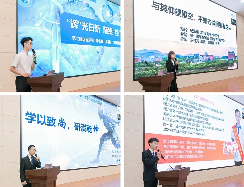 现场评选中,选手们展现了他们在科技创新、临床实践、公益志愿、文体素质等方面的突出表现。第一临床医学院(信息与工程学院)18级内科学博士研究生杨乐和潜心科研、矢志不渝,积极投入到新冠肺炎COVID-19临床研究,开展慢性肺动脉高压综合防治成果的临床推广支援西部医疗;眼视光学院(生物医学工程学院)18级眼科学博士研究生林娜将科研写在祖国大地,勇做川藏青光明行领航者、践行者、守护者;立志成为医学科学家的黄君婷,敢于实践、敢于创新,带领团队志愿者们开展实地调研与问卷调查器官捐献工作情况,创新性提出“在医保卡上显示器官捐献志愿”并促成其在温州落地……