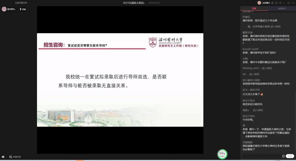 本次宣讲嘉宾为党委研究生工作部、研究生院副院长郑曼曼。直播从下午两点正式开始,郑曼曼从学校基本情况、研究生教育现状、招生政策解读以及复试注意事项等方面逐一展开深入细致的讲解。在长达两个小时的线上直播中,除了基本的政策解读,郑曼曼还与在线观众进行积极互动,耐心解答线上观众提出的与考研以及复试相关疑问,直播现场气氛热烈。本次直播累计在线人数近千人,收集、解答各类招生相关问题一百余条,取得了良好的宣传与答疑效果。