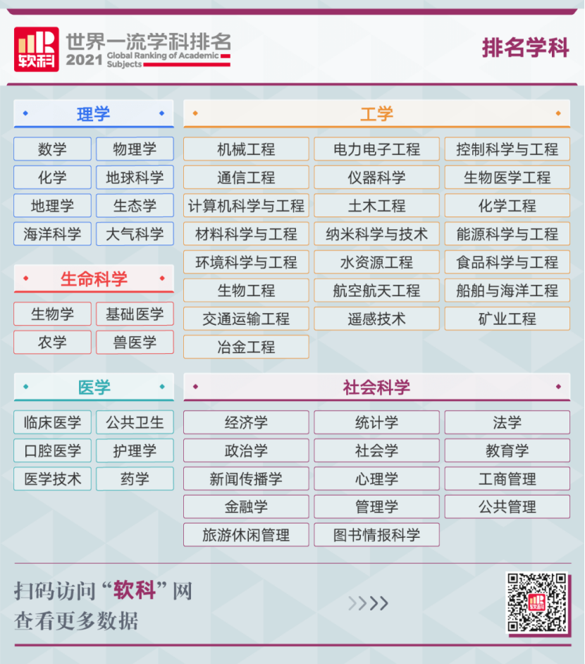 本次发布的排名榜单覆盖54个学科,涉及理学、工学、生命科学、医学和社会科学五大领域。此次排名的对象为全球4000余所大学,共有来自93个国家和地区的1800余所高校最终出现在各个学科的榜单上。