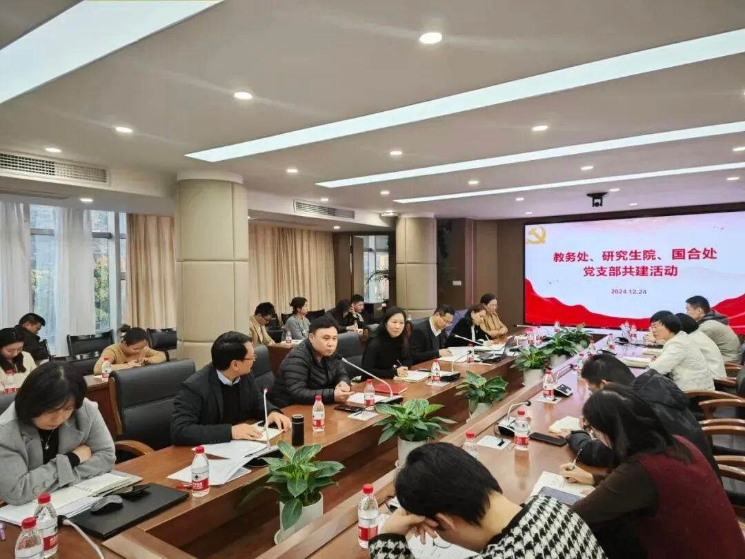 为深入学习贯彻党的二十届三中全会精神,更好激励党员干部担当作为,助力学校教育教学事业高质量发展,12月24日下午,教务处、研究生院、国合处党支部在同心楼4楼会议室开展了支部共建活动。校党委委员、副校长朱雪波以及教务处、研究生院、国合处全体党员、入党积极分子参加活动。活动由研究生院院长肖健主持。