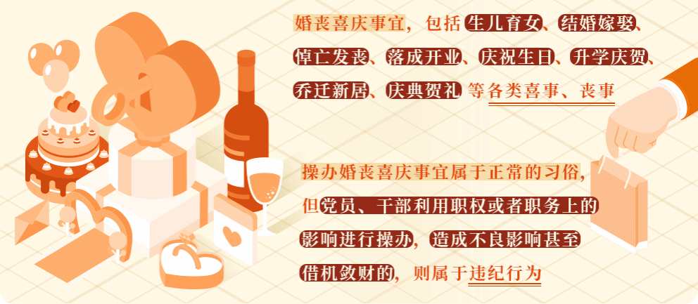 婚丧喜庆事宜本是日常生活中的人之常情,但有些党员利用职权或者职务上的影响大操大办婚丧喜庆事宜,造成了较为恶劣的影响,不但影响正常工作,甚至有的还成为借机敛财的手段。为严格制止这类行为,也是落实中央八项规定精神要求,作出本条规定。