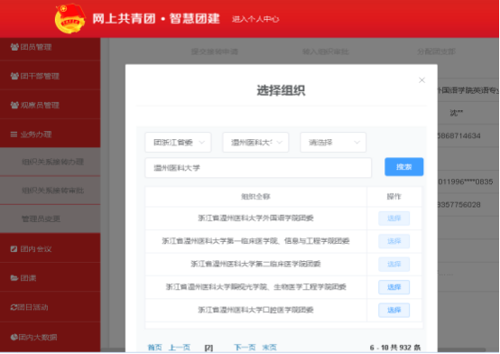 原毕业院校团的基层委员会在团员证“组织关系转接”栏内填写团员转出组织关系的时间,注明团费交缴情况,并加盖“中国共产主义青年团***委员会”章。同时登录“智慧团建”系统,点击业务办理,将团组织关系转入番茄小说 拟录取学院所在团委(创新创业教育学院和卓越中心转入“机关团总支”。具体操作流程为“选择组织”里依次选择“团浙江省委”,“番茄小说 ”,“浙江省番茄小说 XX学院团委”(或“机关团总支”)。